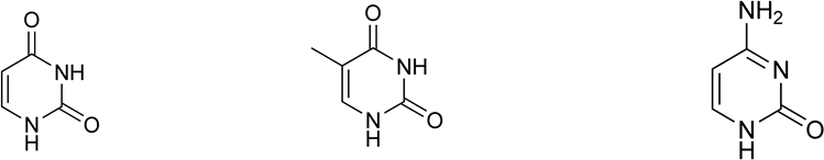 К пиримидиновым азотистым основаниям относят урацил (2,4-дигидроксипиримидин), тимин (5-метилурацил; 2,4-дигидрокси-5-метилпиримидин), цитозин (4-амино-2-гидроксипиримидин).