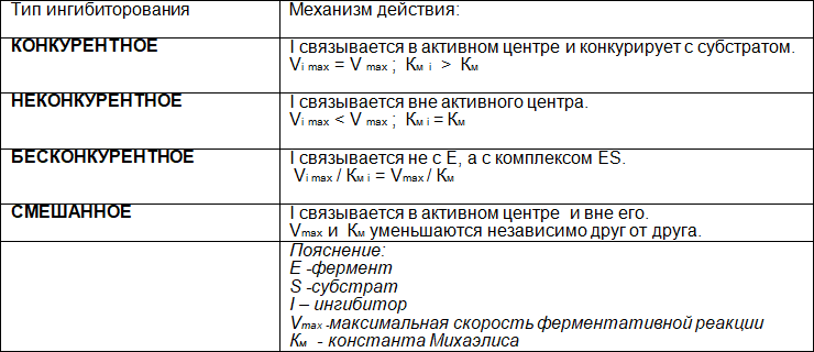 Конкурентное ингибирование – подавление скорости ферментативной реакции веществами, структурно сходными с субстратом. В этом случае, ингибитор связывается с активным центром фермента и вытесняется из него при повышении количества вступающего в реакцию субстрата; ингибирование характеризуется увеличением константы Михаэлиса (КM) без изменения максимальной скорости реакции (Vmax).