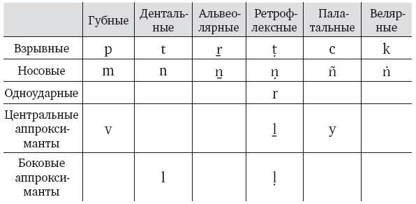В тамильском языке есть краткие и долгие гласные, а также два дифтонга: a – ā; i – ī; u – ū; e – ē; o – ō; ai; au. Глухие и звонкие согласные фонологически не различаются; звонкость зависит от положения согласного в слове.