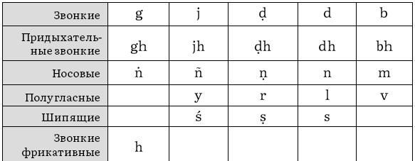 В санскрите есть: долгие и краткие гласные (a – ā; i – ī; u – ū), дифтонги (o, e, au, ai) и слогообразующие сонорные (ṛ – ṝ, ḷ – ḹ).