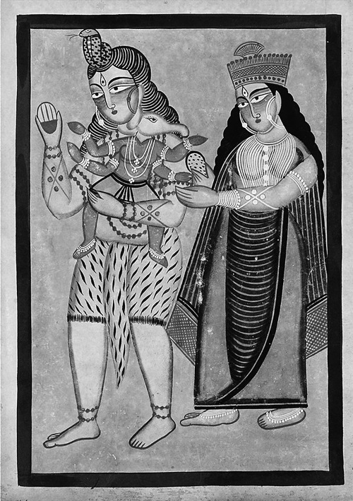 Существует любопытный эпизод, имеющий отношение к Ганеше, где, как и в случае со Скандой, отражен конфликт двух матерей. Вот какую историю рассказывает «Матсья-пурана» (154. 499–505). Как-то раз Парвати с подругами стала играть в куклы (kṛtimaputraka)[47]. И вот, создав из притирания и грязи человечка с головой слона, бросила его в Гангу. Там мальчик стал расти и вырос до огромных размеров, став величиной со вселенную. Когда Парвати позвала его, назвав сыном, он подошел к ней. Но и Ганга позвала его, назвав сыном, и мальчик подошел к ней тоже. Поэтому Ганешу называют Гангея, то есть Сын Ганги, а также Двайматура – Имеющий двух матерей.