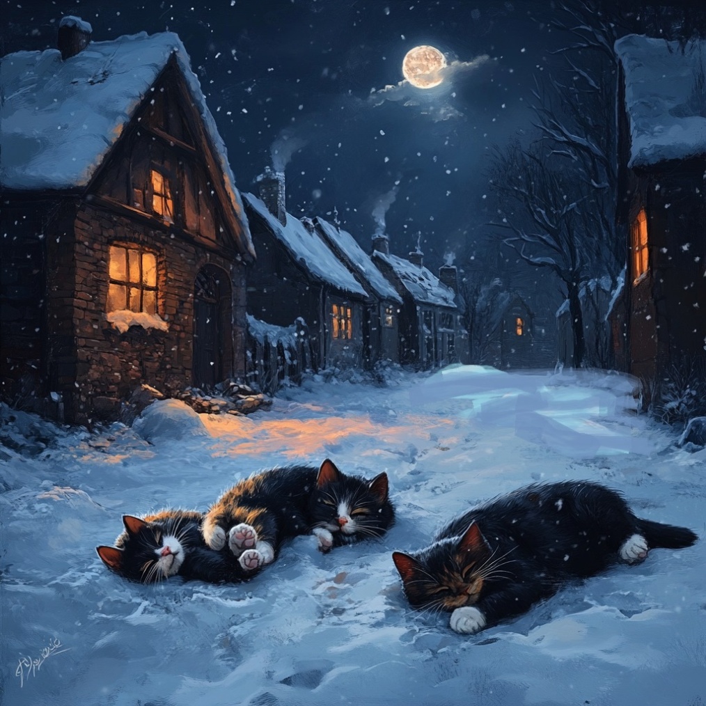 Он добрался до знакомой тихой улочки на окраине. Черничку и котят он увидел сразу. Недоброе предчувствие кольнуло Джинджера. Почему они лежат посередине улицы? И зарывшись в снег? Когда Джинджер подбежал к ним, никто не шевельнулся. Снежинки тихо ложились на их розовые носики и не таяли.