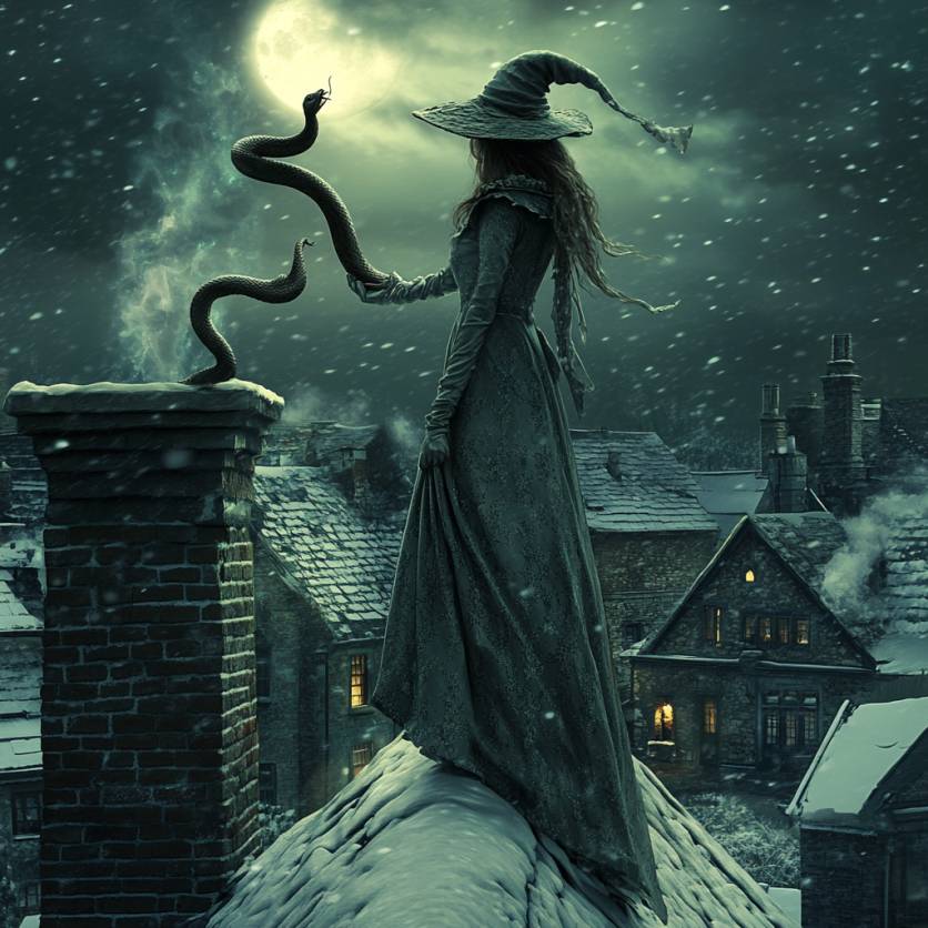 Вызвать испуг, отвращение, омерзение, брезгливость и т.д. – она обожала это. Но время от времени хотелось добиться больших потрясений. Это требовало особой креативности. Гуляя на днях по крышам и заглядывая в окна, Мериэль увидела молодую пару. Муж и жена тоже, как и все кругом, готовились к празднику. Но в отличии от других семейств они не переругивались и ни в чем не обвиняли друг друга, а только улыбались и вместе исправляли случившуюся оплошность. И это Мериэль бесило. Придумать надо было нечто из ряда вон выходящее. И она придумала! Ночью, когда разыгралась вьюга и снег лепил так, что невозможно было открыть глаза, и, все, разумеется, сидели по домам, Мериэль взлетела на крышу, прошла по коньку до трубы и опустила в нее двух змей. Им не очень хотелось туда лезть (змеям, как известно дорогому читателю, полагается зимой спать, а не ползать по дымоходам и комнатам, пугая до смерти хозяев. Но они знали, что с Мериэль не поспоришь).