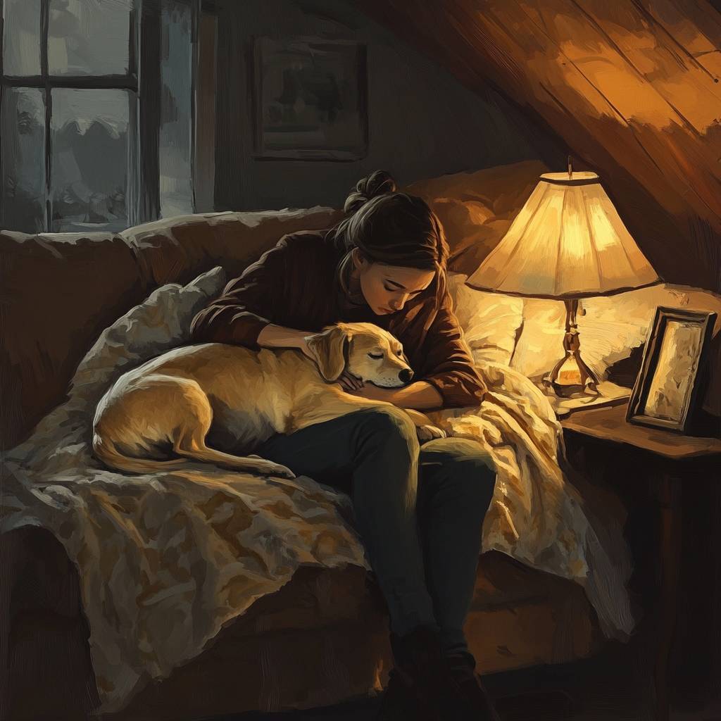 Обстановка более, чем скромная. На диване сидела девушка, собака лежала рядом, положив голову ей на колени. Собака спала, но вдруг поставила уши, подняла голову и посмотрела прямо в окно. Она смотрела отстраненно и сквозь Мериэль. Верхние губы поползли вверх, обнажая клыки, нос сморщится, раздалось слабое рычание.