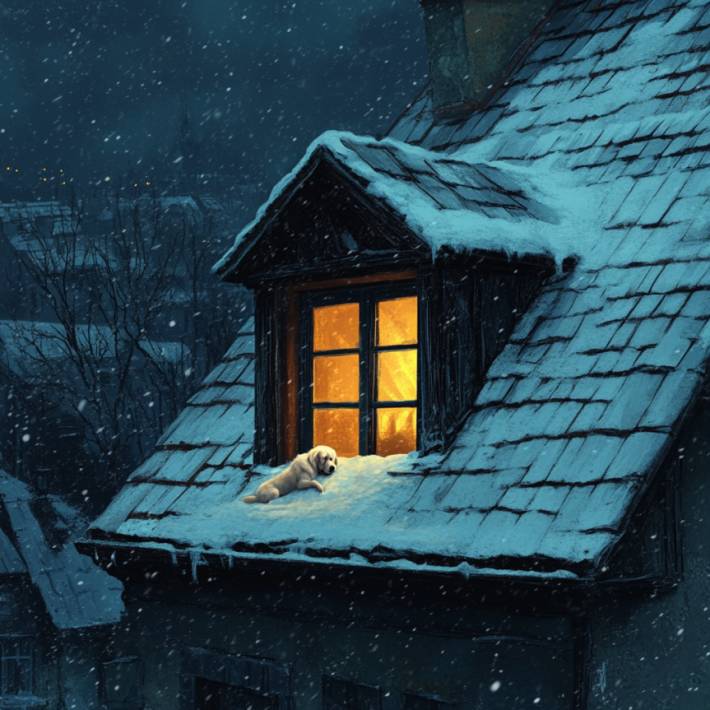 Она навестила пару семейств, которые готовились к празднику, изрядно подпортила им настроение и вернулась к мансарде. На крыше около освещённого окна лежала собака. Снег все больше покрывал ее, но она этого не замечала и неотрывно смотрела в окно, хотя знала, что в мире людей ее больше нет.