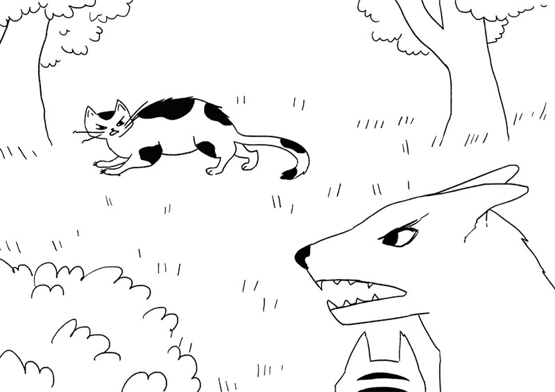 Он оказался на большом поле, окруженном лесочком. Но оно не было пустым. На краю в тени деревьев паслись две косули, мама с малышом. Как только котенок двинулся через поле, мама косуля подняла голову и настороженно повела ушами. Вряд ли она видела в траве котенка, но новое движение уловила мгновенно. Она прислушалась, готовая молниеносно исчезнуть в лесу со своим детенышем. Но, видимо, решив, что движение не сулит опасности, опять наклонилась к траве.