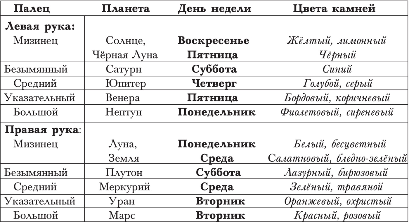 Соотношения пальцев, дней и цвета камней