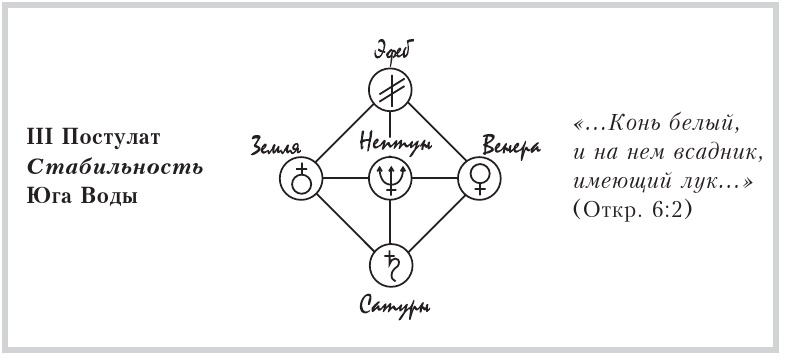 Белый – оккультный цвет Стихии Воды. В руках всадника лук, изогнутая дуга которого является символом фантомов Белой Луны, соотносящихся с принципом Воды. В книге «Сезам, откройся!» подробно описан этот принцип (гл. 2), уяснив сущность которого, легче понять действие Постулата Стабильности. Кратко его можно охарактеризовать как стремление коагулируемого материала возвращаться к первоначальной форме, наиболее плотно и компактно занимающей наименьшее пространство, то есть шарообразной. Это свойство сравнимо с физическим свойством воды, заставляющим ее собираться в каплю. Подчиняясь Постулату Стабильности, все развивающиеся формы «описывают петлю», то есть проходят циклы спиралевидного изменения форм, в эволютивном движении наращивая массу и в инволютивном движении – возвращаясь к первоисточнику и первоформе, отбрасывая, как шелуху, отработанный и синтезированный материал. По этому принципу происходит развитие всех форм. Так и человек идет в Познание спиралевидным опусканием в материал. Принцип Стабильности, контролируя его «массу» и не давая ему «утонуть», заставляет вовремя повернуть назад к изначальной форме.