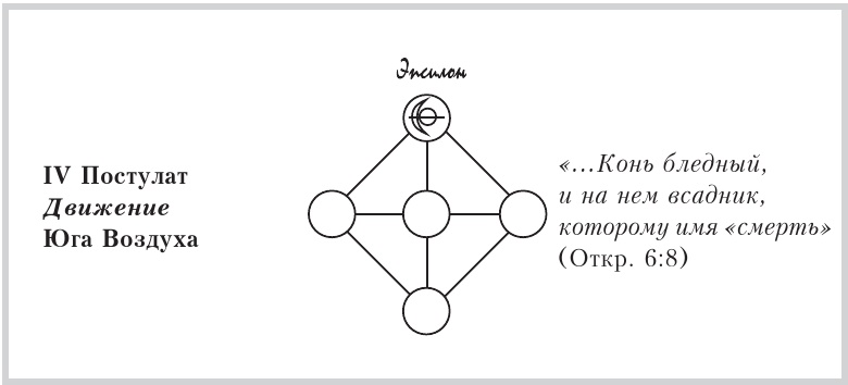 Определение «бледный» в данном контексте соответствует бесцветности воздуха и его всепронизывающему свойству. У всадника же на «бледном» коне нет атрибутов, ибо, как вы помните, Юга Воздуха еще не построена, но Постулат, или Владыка Кармы, которому эта Юга соответствует, уже существует и по принципу его действия ему дано имя – Смерть. Этот Принцип можно рассматривать как «смерть» целостности, разделение на множественности в процессе движения. Весь План, или Путь Познания, подразумевает движение от точки Исхода к точке Возврата, где, в конечном счете, множественности в процессе трансформации сольются в единое состояние новой Целостности.