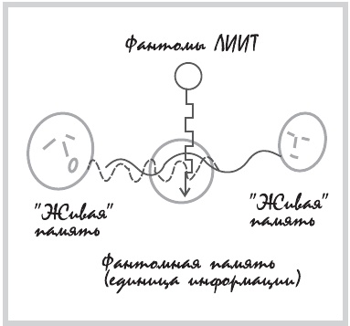 В приближенном варианте механизм рождения групповых клише выглядит как образование «ложной троицы» и выделение из нее «мертвого сына» – единицы коммуникативной памяти. В образовании таких «единиц информации» участвуют живые сущности, носители личностной памяти. Вступая в контакт (энергетический обмен информацией – Качество 5-й Зоны), сущности как бы резонируют, организуя диссонирующую вибрацию, которая имеет бинарный характер (рис.10). Захватывая материал, этот двойной турбулент образует новую единицу, отдельно существующую и пронизанную фантомами Лиит. Это уже «общая память», информационная единица, но не живая, а фантомная, обладающая заданной вибрацией, прообраз зомби (zombie – англ. «оживший мертвец»).