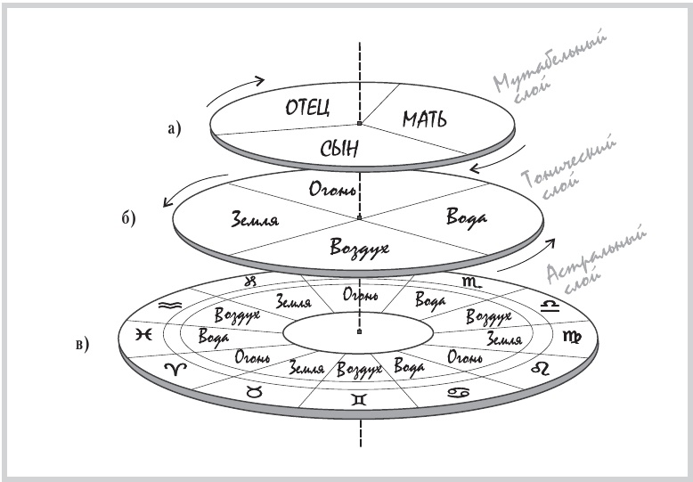 Зодиак традиционно изображается в виде круга (плоскостного среза турбулента). Первой (высшей) проекцией на плоскость Литана неминуемо должен был стать Принцип Троичности (Отец – Сын – Мать), который и выразился в разделении круга на три соответствующих сектора – Кардинальный, Фиксированный и Мутабельный (рис. 16а). Оккультное значение этих секторов заключено в качествах циклов от А до Я, то есть подразумевает весь План. Если вы внимательно ознакомились с главами книги «Сезам, откройся!» о Посвящениях51, вам станет понятен смысл этого Плана в применении к циклическому пути человеческого познания. Тройственное разделение – это первый уровень конкретизации Целостности, граничащий с уровнем Постулатов. Второй сверху по вертикали плоскостью можно считать уровень секторов круга, имеющий в своей основе разделение по кресту, подобному Кресту Стихий, с сохранением их оккультных наименований: Огонь – Земля – Воздух – Вода (рис. 16б). Это разделение проецируется уже с Тонического слоя. Каждый из четырех секторов этой плоскости соответствует одному из Постулатов, определяя законы развития материала в более плотных слоях. Последовательное освоение каждого сектора «стихий» определяет индивидуальный характер соответствующего отрезка пути – стремительность, текучесть, легкость или консерватизм. Эти определения достаточно приблизительны, но на уровне интуиции могут быть поняты как отличительные характеристики движения.