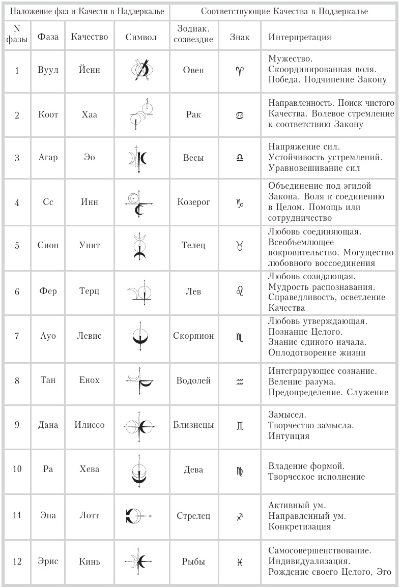 Дело в том, что принцип Мастеров (2-й Аспект I Принципа Троицы) приобретает оформленность в Качество и дискретность только в процессе адсорбции какой-либо материальной субстанцией. Будучи материализован внутри Земли и коагулируясь в Царей Зон, он таким образом инициирует выделение определенных энергетических свойств в материале. Эти свойства, получившие благодаря фантомам Лиит доступную познанию и интерпретации форму, и именуются нами Качествами. Но Качества, не ограниченные цикличностью, то есть не несущие принцип турбулента, нестабильны и мертвы, так как не имеют связующего центра и находятся в инертном состоянии (см. Постулаты Закона). Поэтому на каждом уровне расшифровки в материале они сливаются с соответствующими фазами движения – циклами. То есть каждый отрезок Пути на уровне Литана имеет временную и качественную характеристику, соединяясь в 12-фазном кольце. Мы можем изобразить это совмещение в виде сетки, в каждый сектор которой попадает порядковый номер и фаза Цикла и соответствующее Качество, форма которого символизируется энергетическим именем и пантаклем (таблица 9).