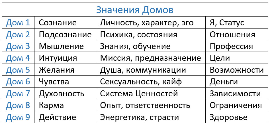 Таким образом, изучение значений девяти Домов даёт возможность более глубоко осознать внутренние и внешние процессы, формирующие нашу судьбу, и увидеть, каким образом разные стороны жизни взаимосвязаны и как числа влияют на нас во всех сферах жизнедеятельности.