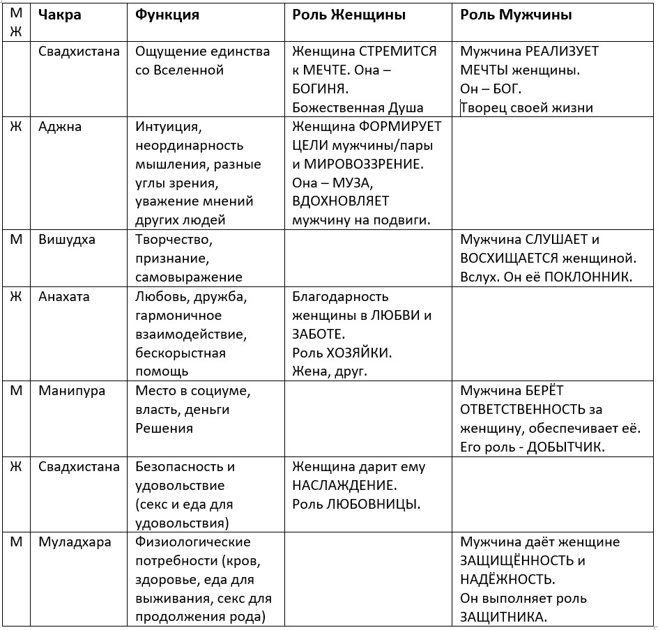 Это мужская чакра, и на этом уровне мужчина обеспечивает в паре достаточно качественный фундамент. То есть он создаёт для женщины условия, в которых она будет чувствовать себя безопасно.