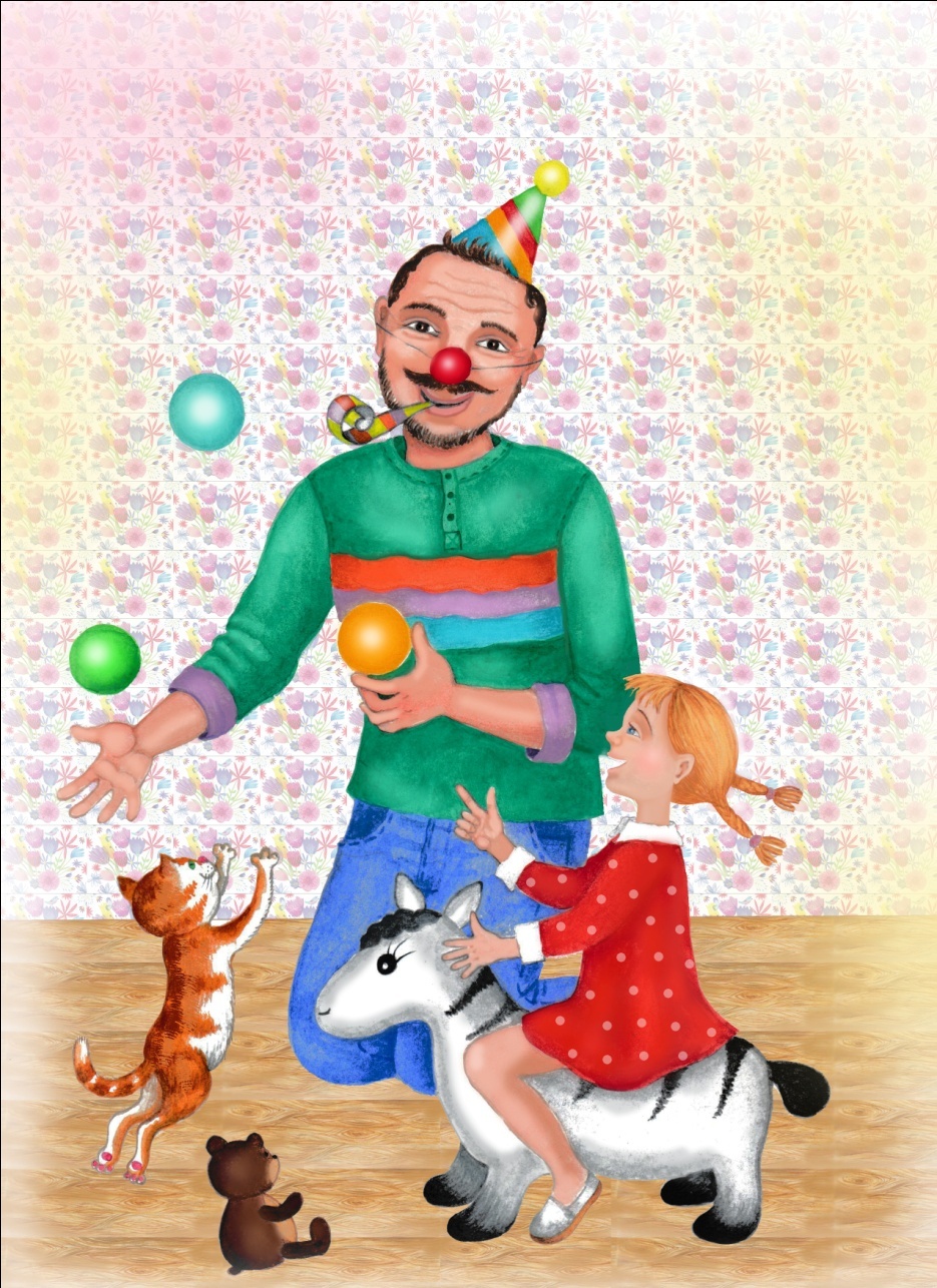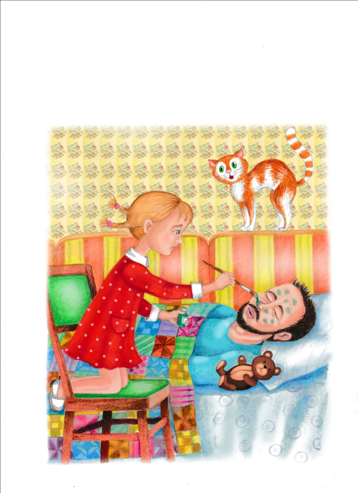 И всё-таки взрослые напрасно смеялись. Зелёнка помогла папе. Он начал поправляться и вскоре совсем выздоровел. Но с тех пор перестал играть с Маришкой в лошадок. А вот идея с весёлым клоуном, папе понравилась. Только без зелёных веснушек и носа. Папа сказал, что румяным, красноносым ему быть намного приятнее и велел вернуть лекарство бабушке.