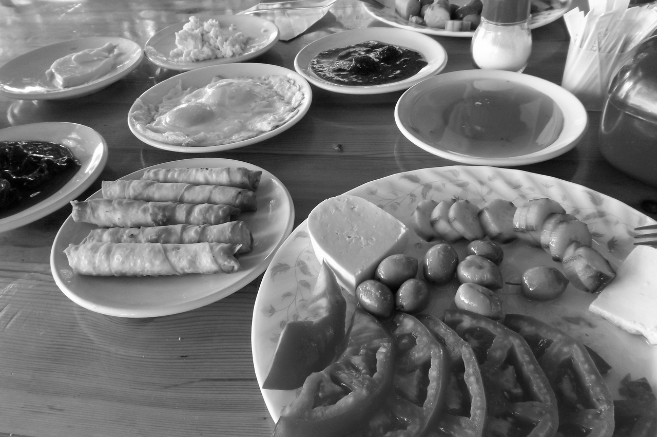 В турецком завтраке продумано все. На столе должно быть то, что можно намазать на хлеб, или во что можно хлеб помакать. Такое на первый взгляд «дробное» питание из маленьких мисочек выливается в очень большое количество съеденной пищи. Завтракающий периодически зависает над столом с кусочком хлеба в руке, выбирая, во что его макнуть или что на него намазать. Причем, очередность соленое-сладкое не соблюдается никак. Сначала может быть съеден мед, а потом – острая аджика, затем сыр с оливкой, джем и так далее.