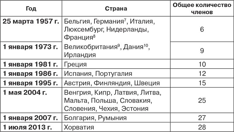 • постепенное присоединение к образовавшемуся ядру новых государств, которых с 1 июля 2013 г. стало 28;