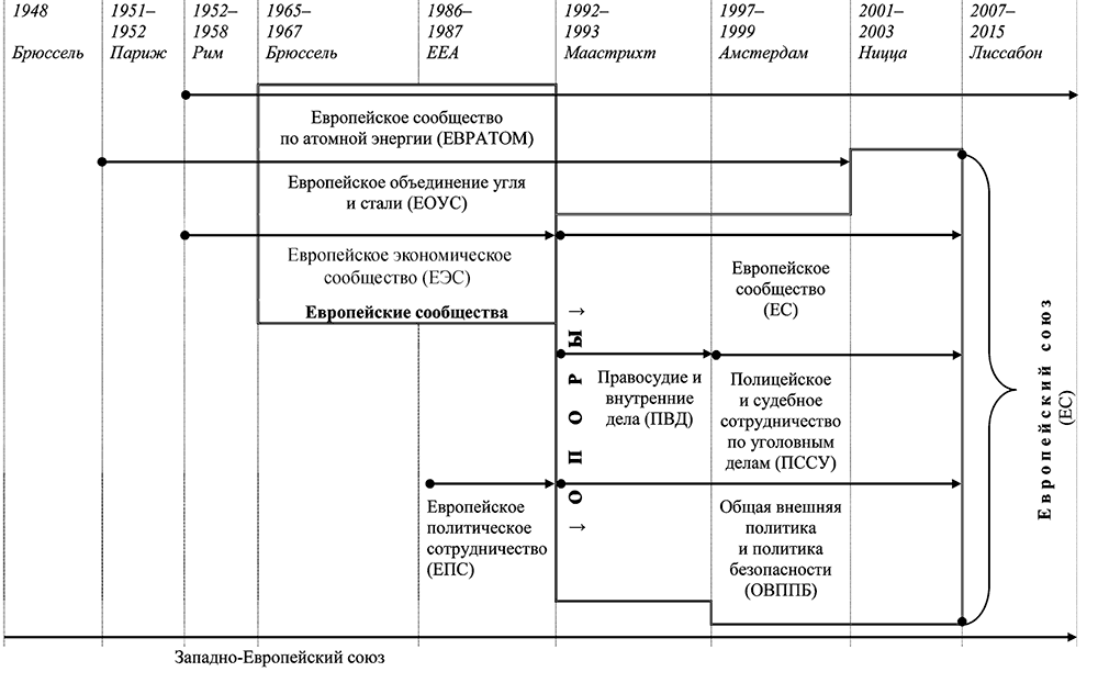 Рис. 1 демонстрирует процесс образования и трансформации Европейских сообществ и создания современного ЕС.