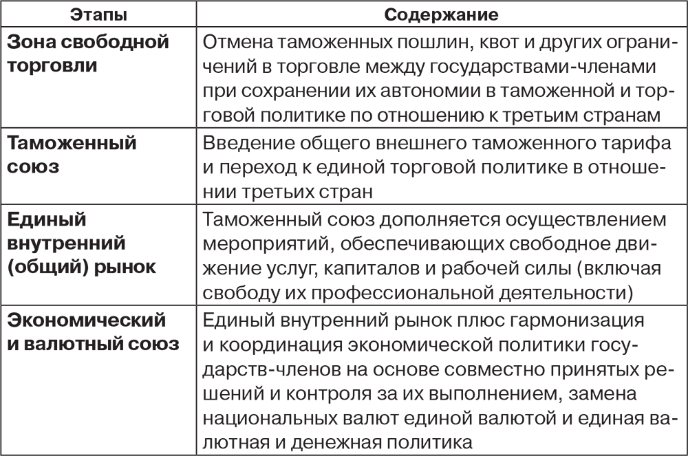 Теоретическая модель, разработанная западными экономистами, предусматривала четыре этапа европейской экономической интеграции (табл. 2).