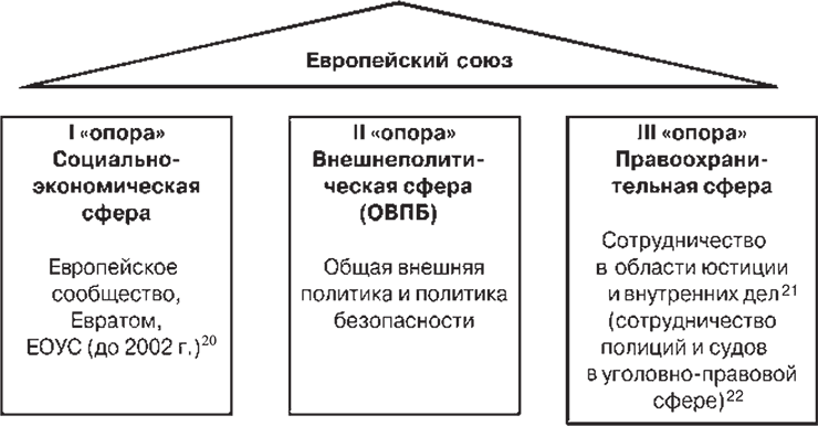 Суть этой структуры заключается в следующем: организация Европейский союз создается не как единая конструкция (с единой правосубъектностью, компетенцией и т. д.), а как сумма трех автономных правопорядков – трех «опор».