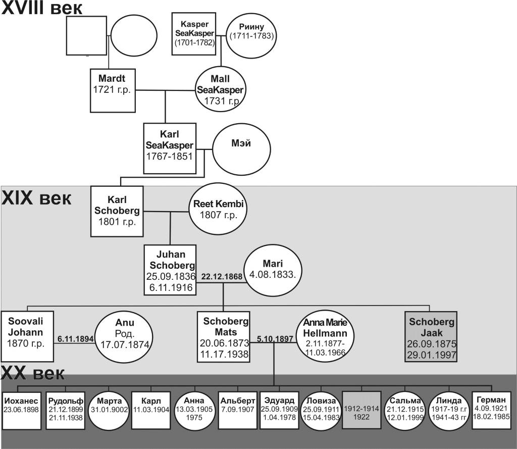 У моего пра-прадеда Карла, родившегося в 1800 году, в ревизии 1834 года уже указана фамилия – он Karl Schoberg. Его жену звали Рит /Reet Kembi/ (1807 г.р.). У них было шестеро детей: сыновья Пит /Peet/ (родился в 1831 и умер в 29 лет), Юган (1936) и Март /Mart/ (родился в 1853, умер, вероятно, в младенчестве), дочери Рино /Rino/ – 1840, Мэй /Mai/ – 1846, Мари /Marri/ – 1851. Второй ребёнок Карла и Рит – Юган /Juhan Schoberg/, родившийся 25 сентября 1836 года11 – был моим прадедом. Он прожил 80 лет и умер 6 ноября 1916 года. 22 декабря 1868 года он обвенчался с женщиной баптистского вероисповедания Мари /Mari/, которая была старше его на 2,5 года. Юган и Мари – родители моего деда Матса, будущего переселенца из Прибалтики на Дальний Восток.