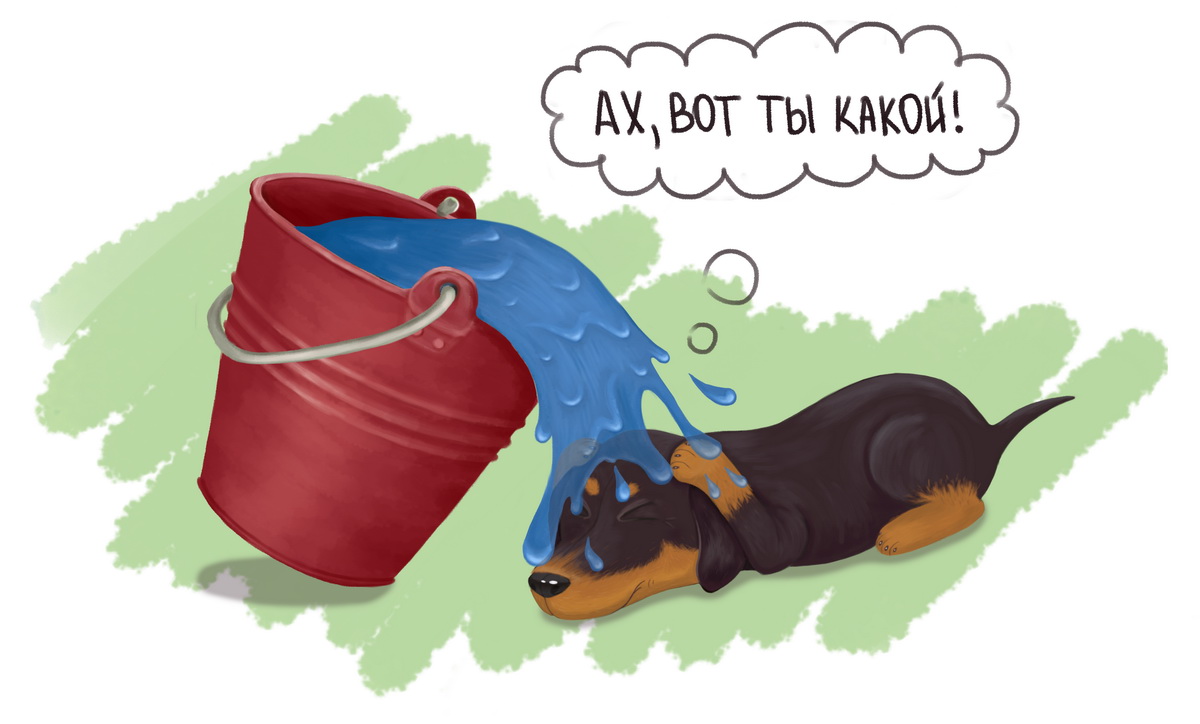 «Так вот кто здесь живет! Нужно рассмотреть его поближе…» И Дамка постаралась ещё чуть-чуть подпрыгнуть. Но тут ведро опрокинулось, и вода окатила её с головы до ног! От испуга Дамка жалобно тявкнула, отскочила в сторону и…оказалась на диване! Ещё ни разу ей не удавалось самостоятельно забраться сюда.