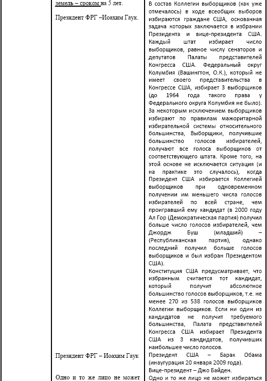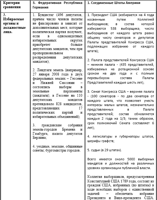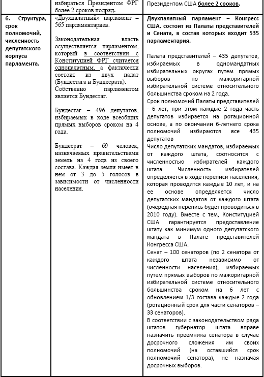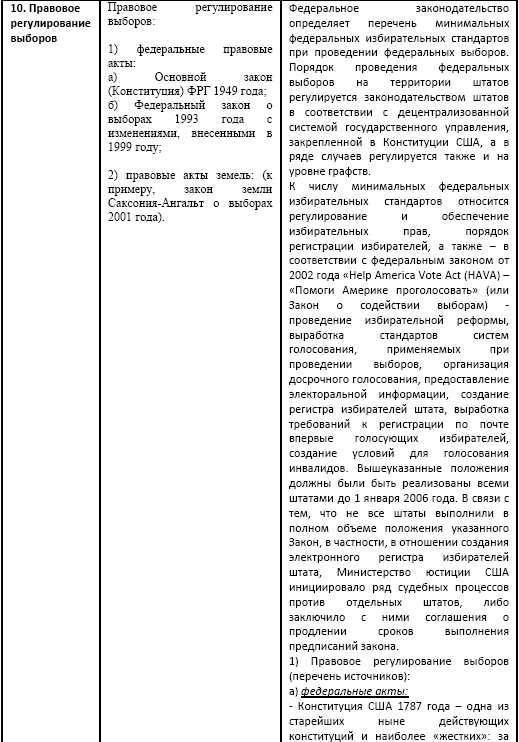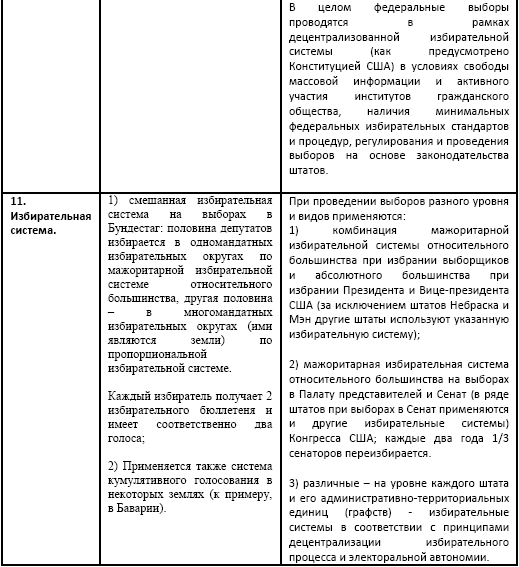 Сравнение особенностей избирательной системы Германии и США. (В. Е. Чуров. Демократия и формы ее реализации в различных странах мира. Табл. 3.: http://rudocs.exdat.com/docs/index-318181.html?page=4)