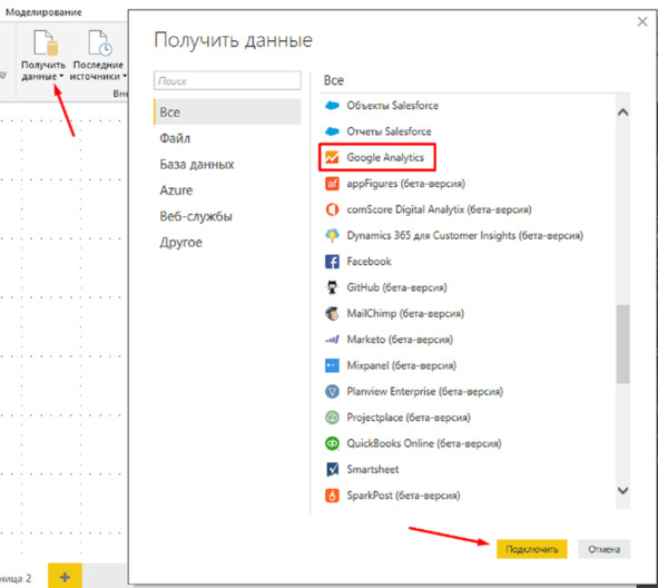 Выбираем необходимый источник сведений, к примеру, Google Analytics.