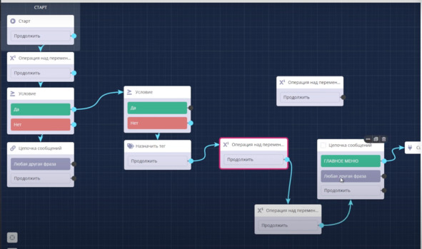 Таким образом бот будет знать новое количество рефералов и данное число умножать на 100 и прибавлять к новым баллам. После всех этих вычислений я также буду использовать блок Операция над переменной, в которой формируется переменная получен 1 уровень с текущим количеством всех рефералов.