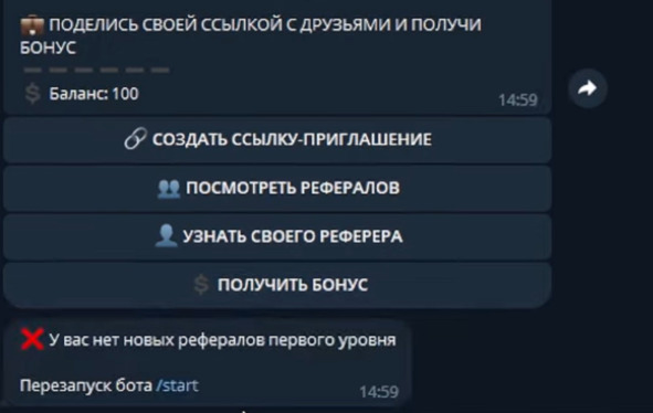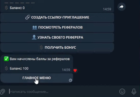Если я войду в Главное меню и сразу кликну опять на кнопку Получить бонус, то мне бот ответит: