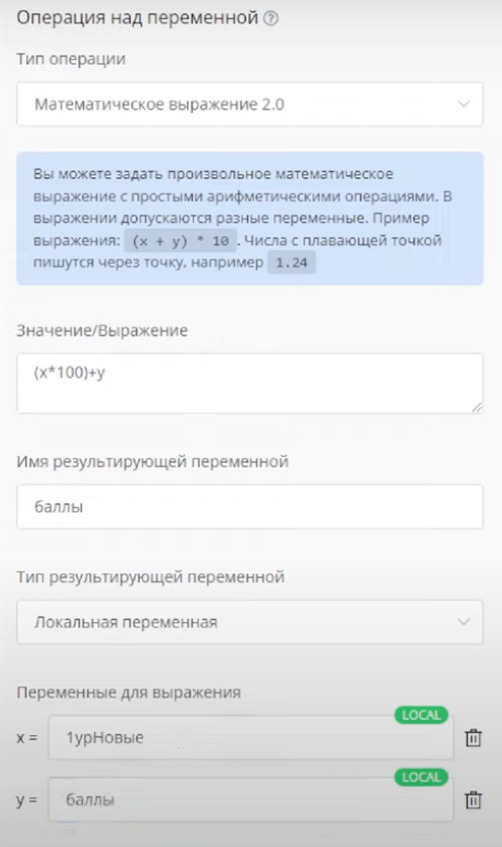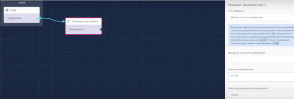Оставляю только блок Старт. Теперь добавляю блок Операция над переменной. Математическое выражение. Буду использовать переменную Баллы и значение Х +100: