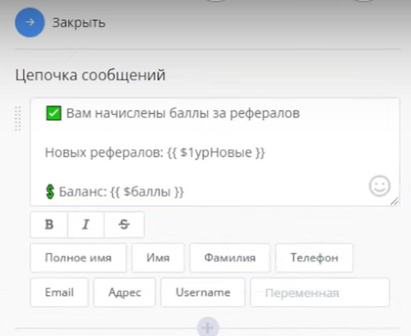 После этого можно добавить блок Цепочка сообщений, где сообщаем о начислении баллов: