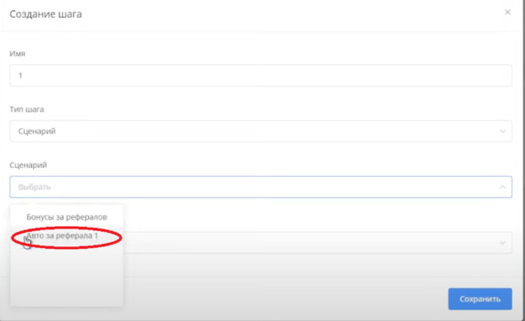 Добавляю шаг и выбираю сценарий Бонус за рефералов тот, который я создала в ручном режиме. Можно здесь настроить дни недели и время отправки бонусов.