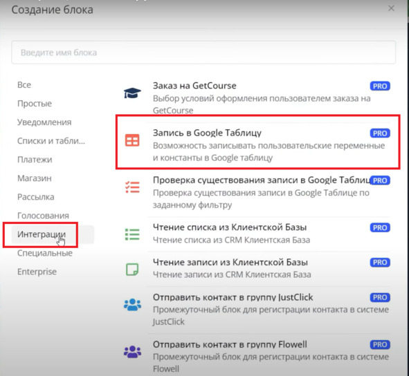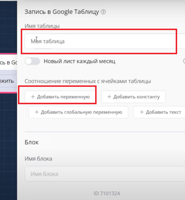 Ответы сохраняем в Гугл – таблицу. Добавляем Блок: