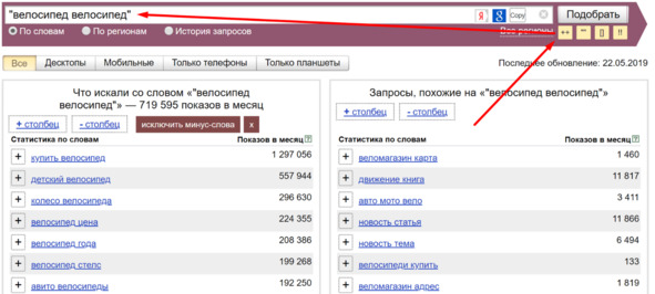 Он добавляет плюсики около каждой поисковой фразы. Если мы на него кликнем, то фраза выводится в левое окошко. Так же в это окошко мы можем добавить список фраз, которые заранее собрали и отсюда скопировать в Excel табличку для дальнейшей работы.