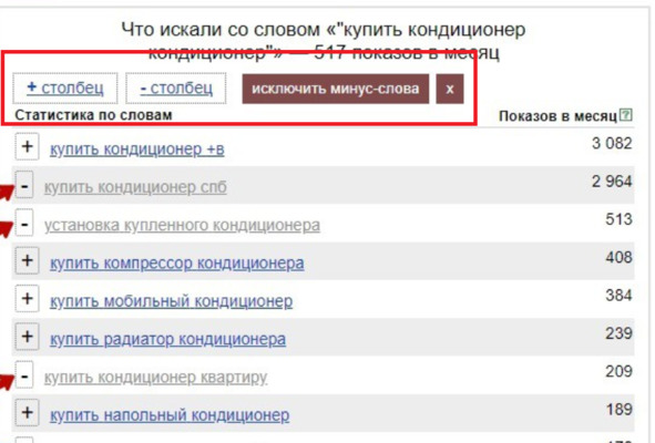 В инструменте Вордстат можно прокликивать слова, которые нам не интересны и они сразу попадают в минус – слова.