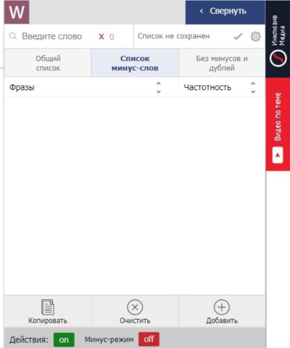 Так же есть плавающий блок, в котором хранятся ключевые фразы, минус – слова и фразы без минусов: