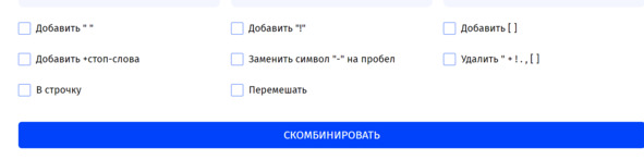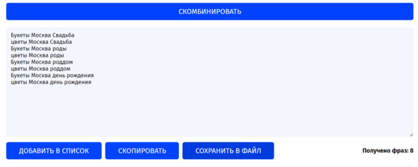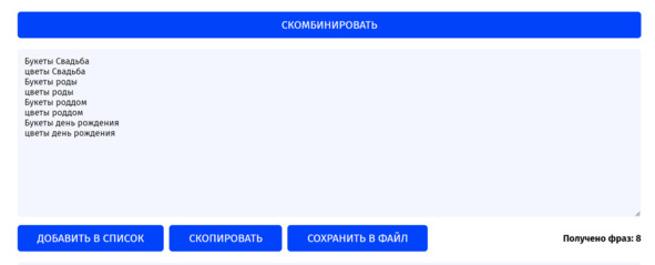 Комбинатор фраз позволит сгенерить искусственную семантику. Если у вас очень сокращен период времени для сбора самой семантики и запуска рекламных кампаний, то можно ограничится сбором искусственных запросов, которые не собирали в Вордстат, а нагенерили через комбинатор. Добавили их к себе в файл и можно использовать в рекламных кампаниях и по ходу расширяйте их более вложенными запросами.