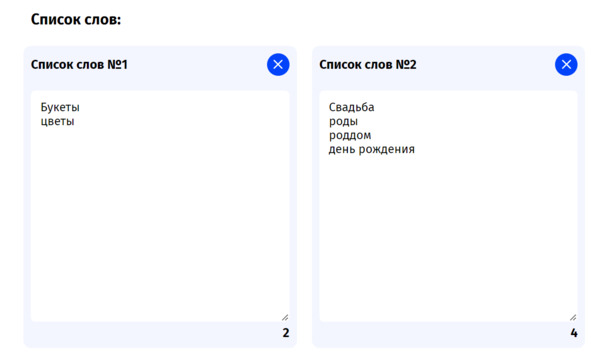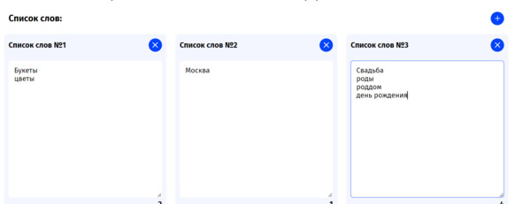 В каждый из этих блоков прописываем слова. Во втором блоке можем добавить приставку. К примеру, продукт рекламируется в Москве, то можно собрать запросы, содержащие в себе различные написания Москвы.