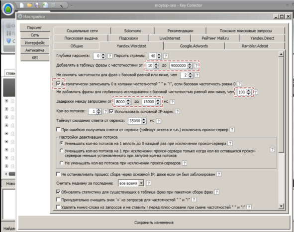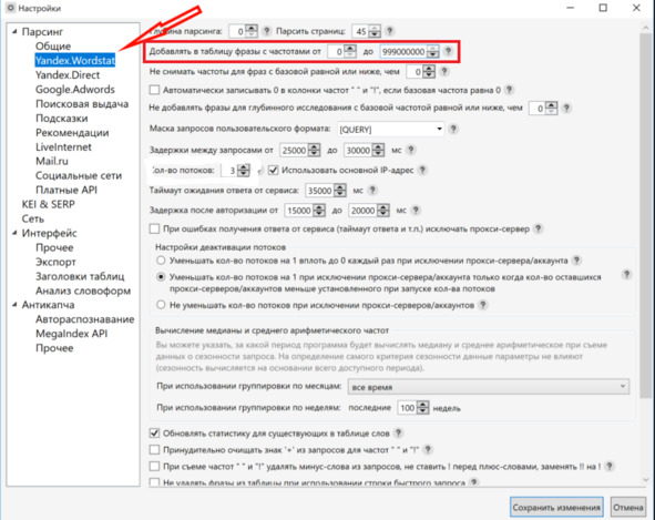 Здесь можем ограничить частоту запросов, к примеру с 10, так как с 1 до 9 может не быть показов. Кликаем Сохранить изменения.