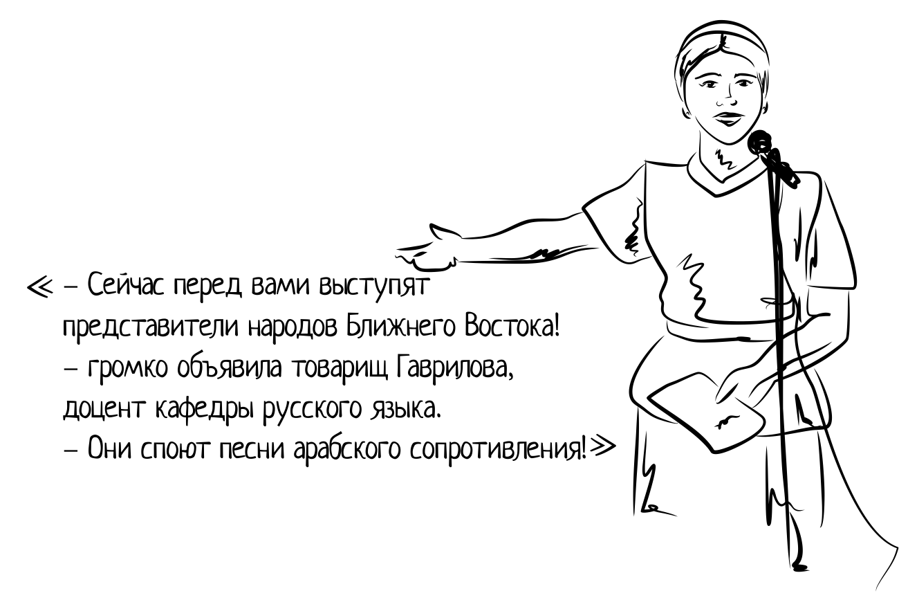 Это удовлетворило Нинино любопытство. Начался концерт, и она вышла на сцену, чтобы объявить первый номер. Арабские ребята должны были выступать в конце концерта. Последнюю часть концерта готовила уже не Нина, а преподаватели с кафедры русского языка. Наряду с арабами, должны были выступить гитаристы из Чили и два танцора из Афганистана. «Сейчас перед вами выступят представители народов Ближнего Востока! – громко объявила товарищ Гаврилова, доцент кафедры русского языка. – Они споют песни арабского сопротивления!» Ребята вышли на сцену и запели. Нина слушала их с двойственным чувством. Вроде, нормальные ребята, веселые, симпатичные. Но вот как подумаешь, что после концерта они поедут домой и начнут взрывать мирные дома и школы – еврейские дома и школы – сердце разрывается. «Успокойся! Не зацикливайся!» – приказала себе Нина.