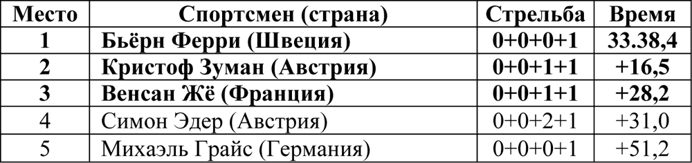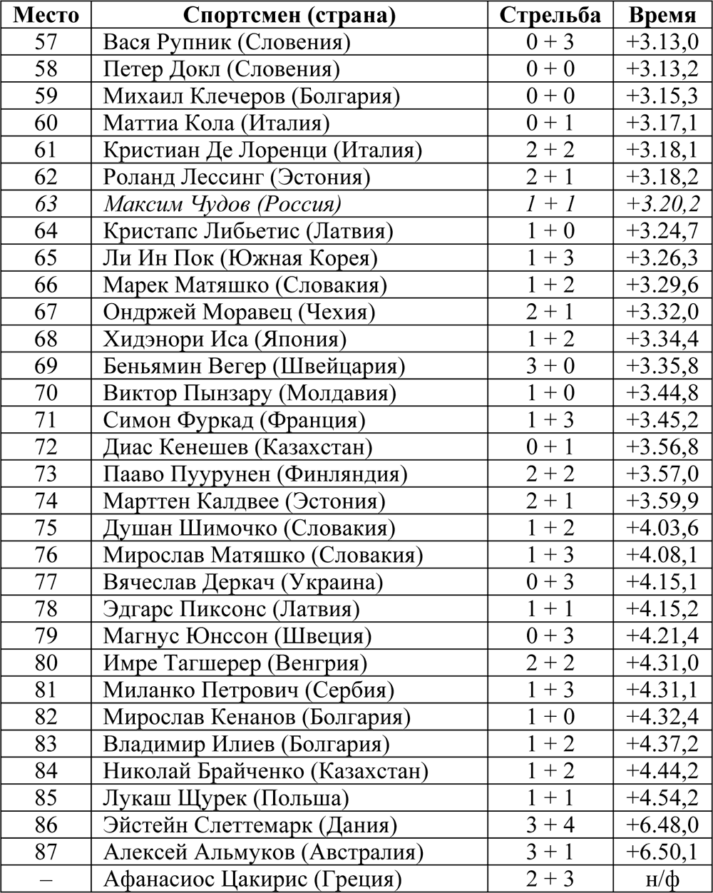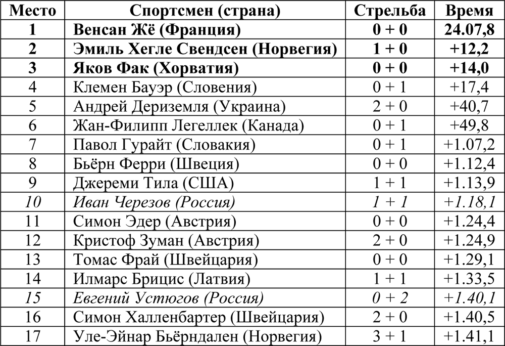 Победитель спринта француз Венсан Жё занял 60‑е место, а победитель гонки преследования швед Бьёрн Ферри стал 42-м.