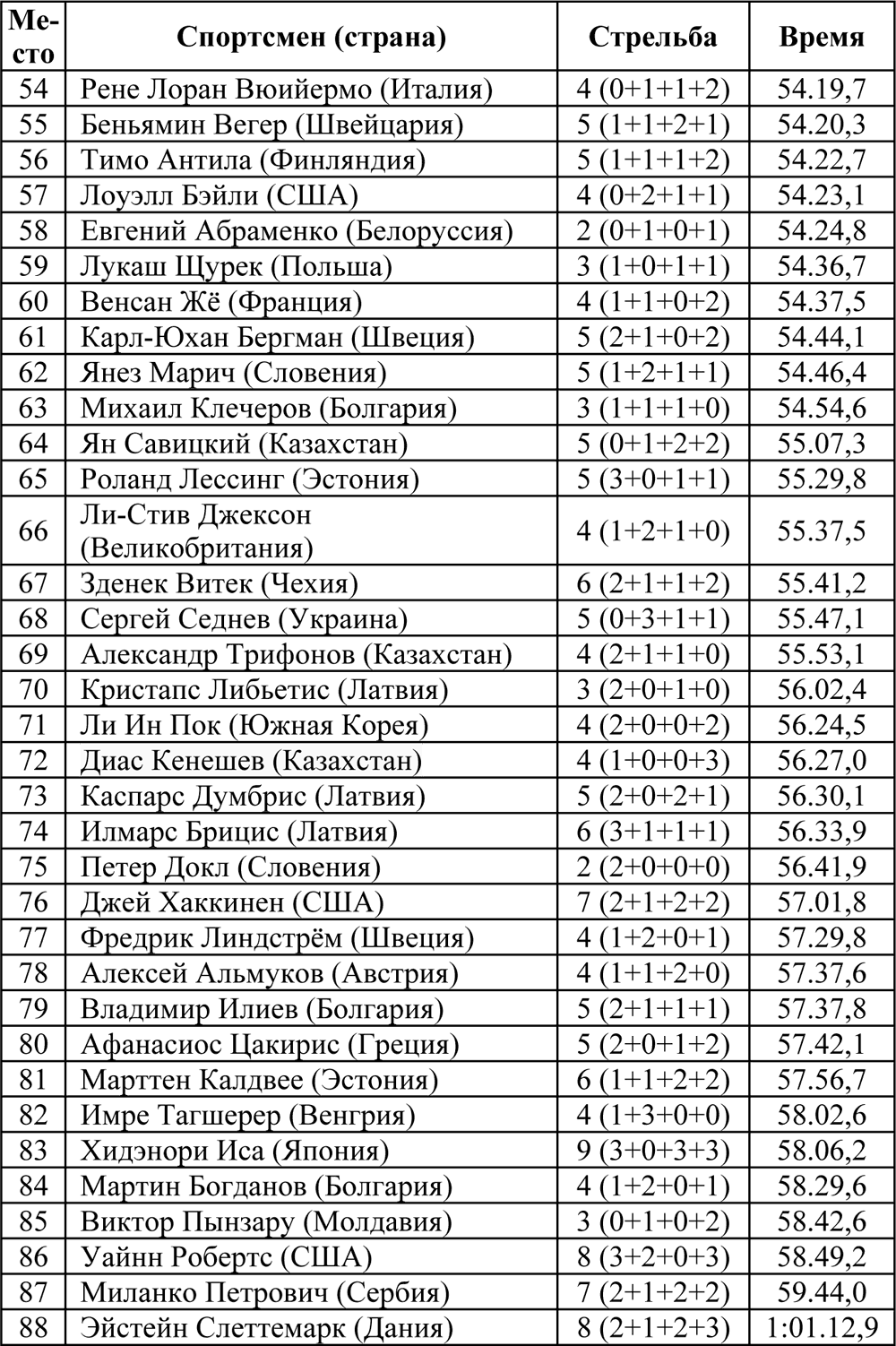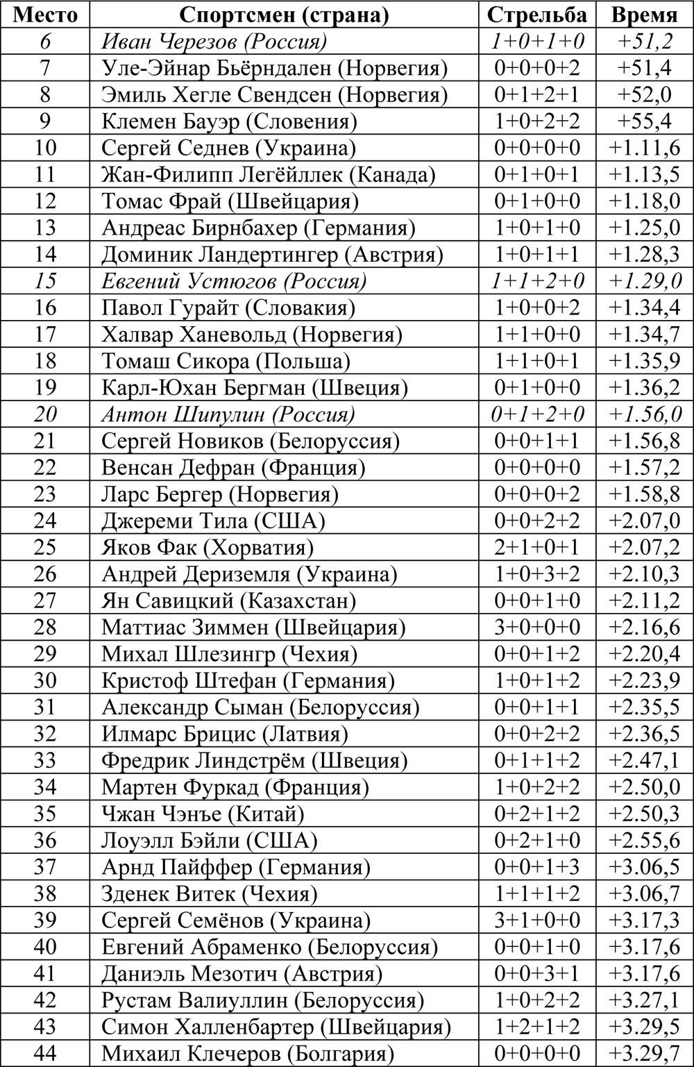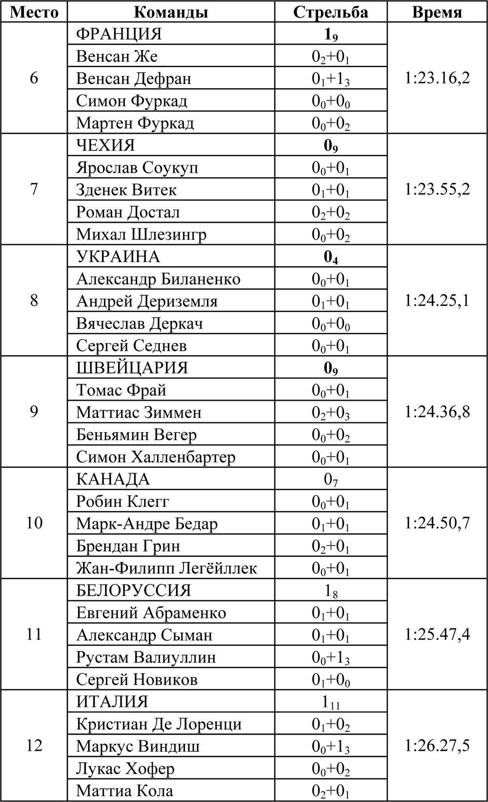 *07 – здеь и далее цифра – количество штрафных кругов, индекс – количество промахов на огневых рубежах.