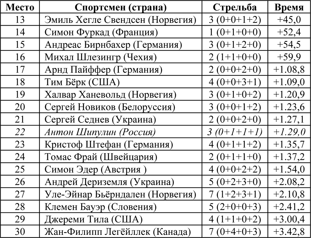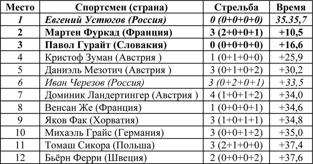 После второго огневого рубежа образовалась группа из одиннадцати спортсменов, отстрелявших без ошибок, но к третьему рубежу их догнали преследователи во главе с Эмилем Хегле Свендсеном, и ситуация вновь запуталась. После третьего рубежа ушла группа из четырёх участников, отстрелявших без ошибки: Павол Гурайт, Евгений Устюгов, Бьёрн Ферри, Венсан Жё и Даниэль Мезотич, который допустил 1 промах ранее. Они пришли к четвёртому огневому рубежу одновременно, но без ошибок отстреляли лишь Устюгов и Гурайт, ушедшие на трассу первыми. За ними с отставанием около 15 секунд от Устюгова ушёл Кристоф Зуман, а ещё через 10 секунд – Мартен Фуркад, Венсан Жё и Симон Фуркад. Устюгов сразу же оторвался от Гурайта и завоевал золотую медаль. Мартен Фуркад обогнал сначала Зумана, а затем и Гурайта, и стал вторым.