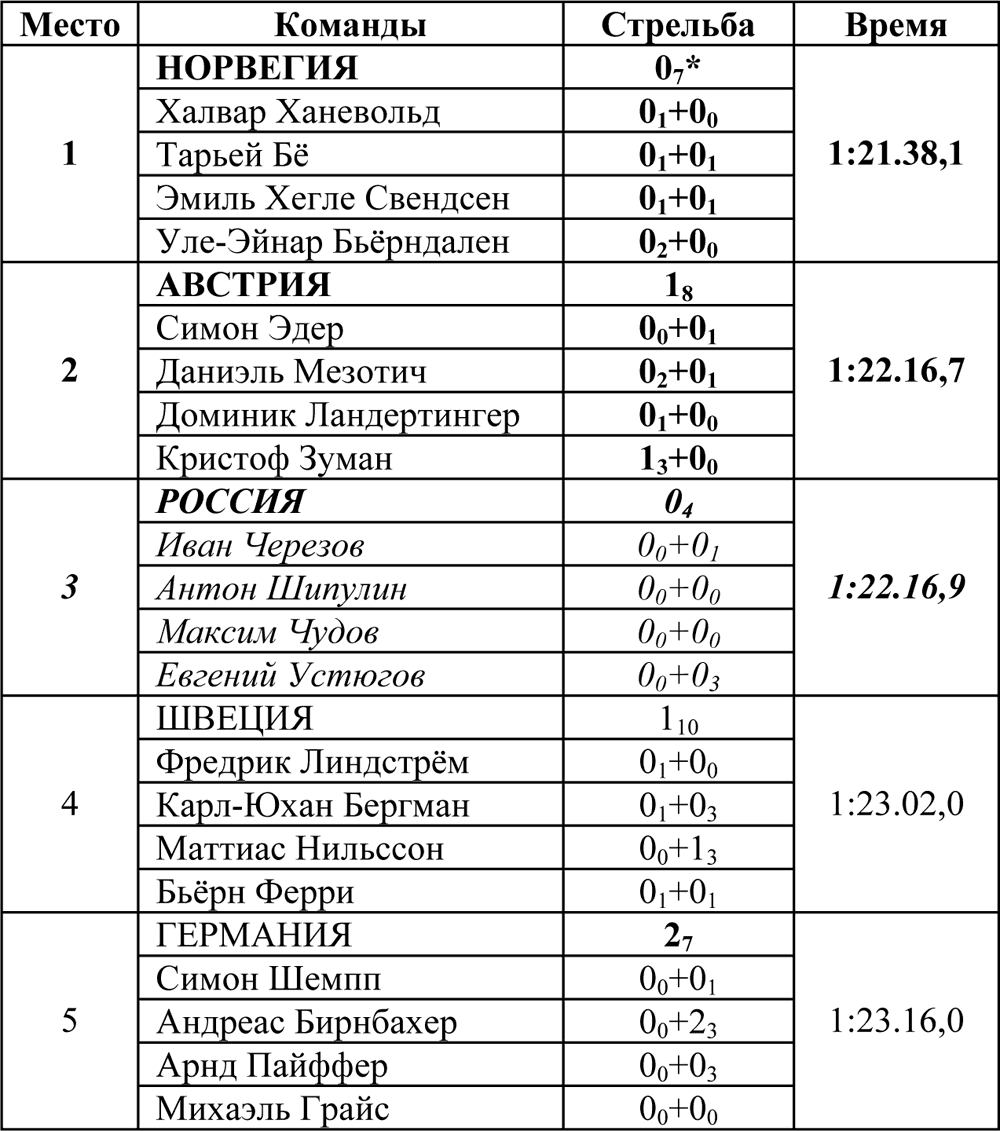 Для Австрии это первая в истории медаль в биатлонной эстафете. Норвегия была первой в Солт-Лейк-Сити в 2002 году, для сборной Норвегии это вторая золотая медаль. Эмиль Хегле Свендсен завоевал вторую золотую медаль в Ванкувере, а Уле-Эйнар Бьёрндален – шестую в своей карьере. Всего у него стало 11 олимпийских медалей, завоёванных на четырёх Олимпийских играх. Больше Бьёрндалена на зимних Олимипадах медалей выиграл только лыжник Бьёрн Дэли.