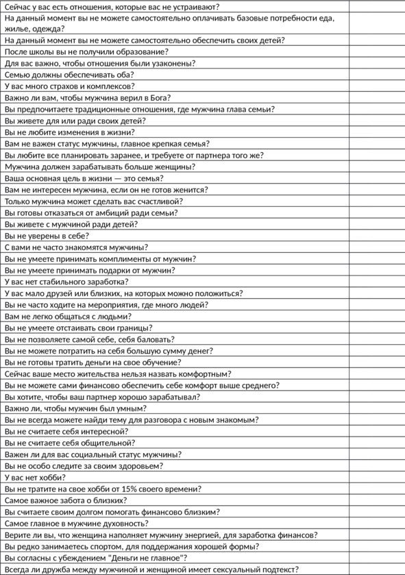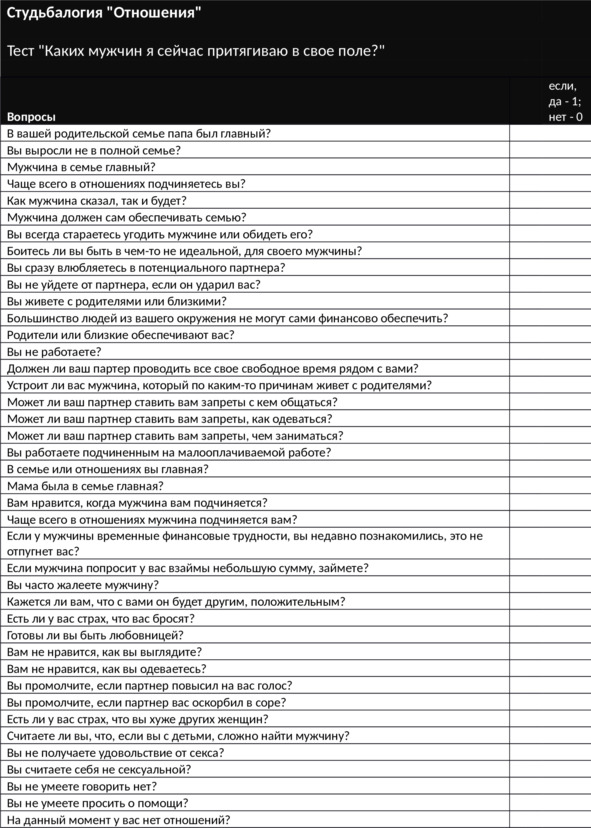 Книга откроет вам глаза на ваши страхи и комплексы. Снимет с вас розовые очки и показывает правду, какого партнера вы сейчас можете притянуть. Эта книга – тест, содержит 100 простых вопросов. Ответив честно на которые, вы увидите не только портрет потенциального мужчины, но и свое психологическое состояние.