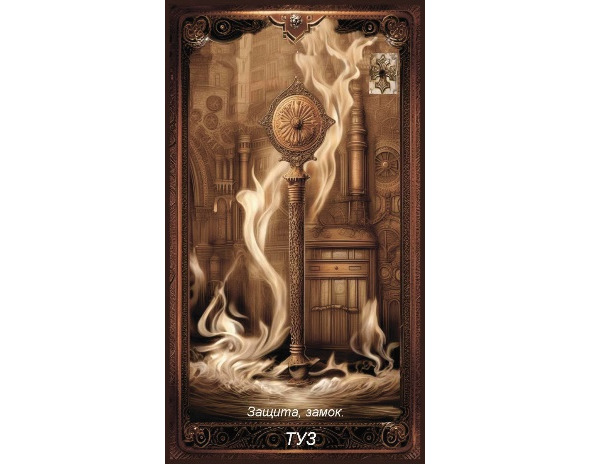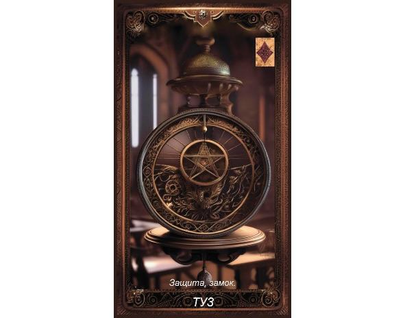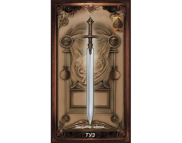 1. Защита: В центре у вас – карта «Вопрошаемый», сверху – Туз Мечей, снизу – Туз Пентаклей, по бокам – Туз Жезлов и Туз Кубков.