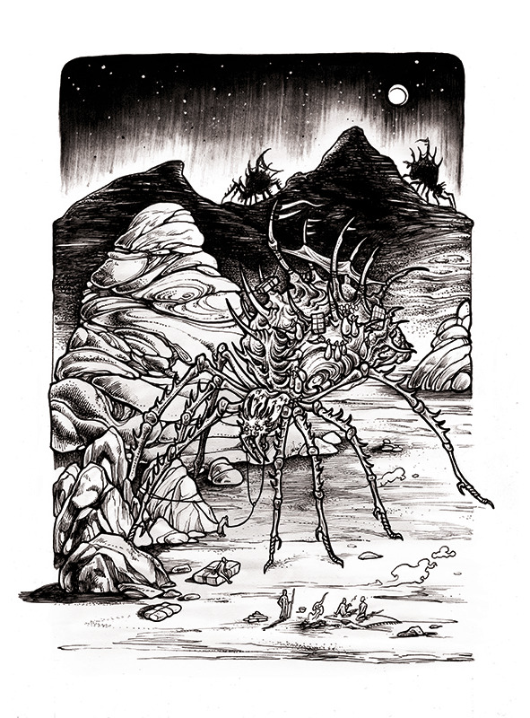 Лодо – гигантские пауки, достигающие от семи до десяти метров в высоту. Углубление в прочных панцирях, в котором звери обычно переносят яйца и детенышей в возрасте до двух лет, используется в качестве пространства для пассажиров. Груз крепится на веревках, натянутых между расходящимися, как лучи, в разные стороны шипами, покрывающими бока и спину животных. Чуть растопыренные четырехсуставные конечности способны выпускать шпоры, которые животное втыкает в землю, чтобы преодолевать сложные участки или защищаться.