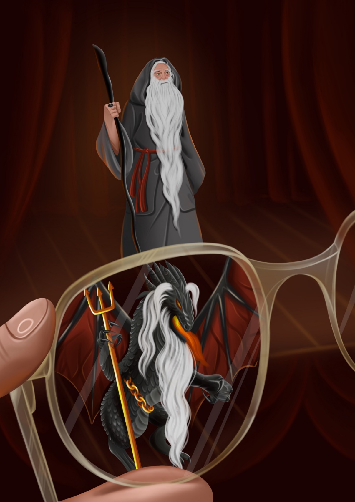Самым впечатляющим был конечно предводитель тьмы тьмущей это был большой чёрный зверь, напоминающий сразу и гигантозавра, и дракона с длинной белой шевелюрой и бородой, доходящей до пола. Вместо языка торчало огненное жало. Примерно посередине мощного туловища, висела толстая огненная цепь. В лапах он держал огненный трезубец. На спине покоились огромные кожаные седые крылья, края которых волочились по полу сцены.