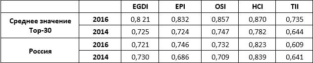 Другую, на наш взгляд, более точную картину дает сравнение динамики измеряемых ООН индексов в 2014 и 2016 гг. (см. табл. 1.6). Это средние значения индексов для 30 лучших стран и индексов российского ЭП. При этом следует учитывать, что составляющие композитного индекса развития электронного правительства EDGI нормализованы (см. выше) и не носят абсолютного характера. Из таблицы видно существенное падение российского индекса телекоммуникаций TII вместе с ростом индекса онлайновых услуг OSI. Тем не менее, этого роста не хватило даже для сохранения EGDI, поскольку одновременно Россия продемонстрировала падение индекса человеческого капитала HCI.